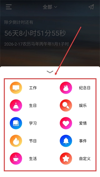 1、在倒计时主界面,点击右上角的功能按钮,能展开分类选项列表,从中挑选要记录的事件类型。