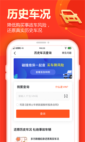 查博士最新版覆盖iOS和Android双平台,提供车辆历史维修保养记录查询、专业检测、精准估价、延保服务四大核心功能。用户可通过输入VIN码快速获取车辆历史报告,结合全国90多个城市的线下检测站,提供198项专业检测服务,并支持一键免费估价,数据覆盖主流品牌,报告由专家团队解读,确保信息准确可靠。