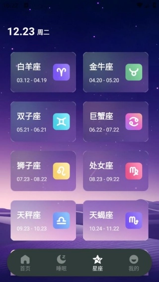 3、整合12星座日期查询功能,内容保持简洁明了,既满足碎片化的趣味需求,又避免过度娱乐化对睡前状态造成影响。
