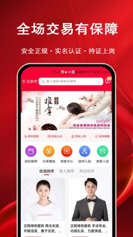 我们的服务类型包含上门按摩、推拿、精油SPA等项目。不管您是想缓解身体的疲惫感,还是希望拥有一段放松身心的时光,我们都能为您提供优质的服务体验。服务全程由平台保障,让您交易无后顾之忧,若未能让您满意,我们承诺全额退款。我们的平台覆盖区域广,技师资源充足,每位技师都经过实名认证、人脸识别以及资质审核,保证用户能享受到专业的按摩、推拿、SPA等健康养生上门服务。