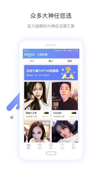 大神功能:您能够查看应用内大神的排名与资料,还可以按照实力、新人、附近等不同维度分别进行浏览和查看。