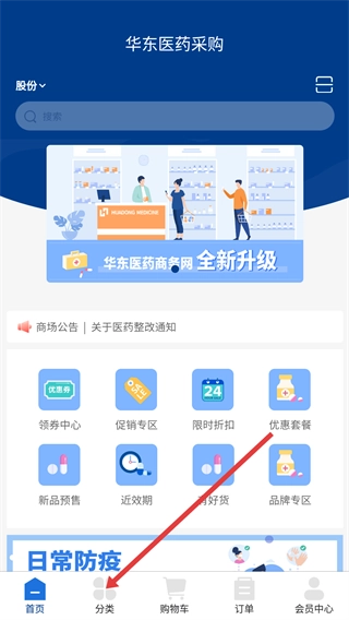 在【华东医药采购】的首页,找到底部导航栏里的【分类】选项并点击,就能进入商品分类相关页面。