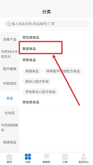 在分类页面的【食品】分类板块中,点击【散装食品】选项,即可进入该类别的商品页面。