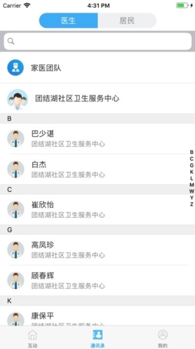 通讯录:可查找所属团队的医生,以及家医团队群,还能与居民发起聊天。