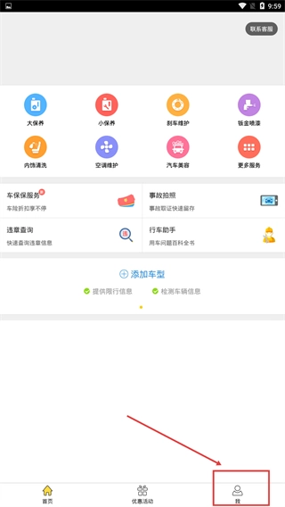 在服务主界面,您可以选择大保养、小保养等服务项目,也能点击底部的【我】功能按钮进入个人页面。
