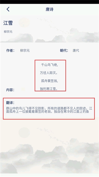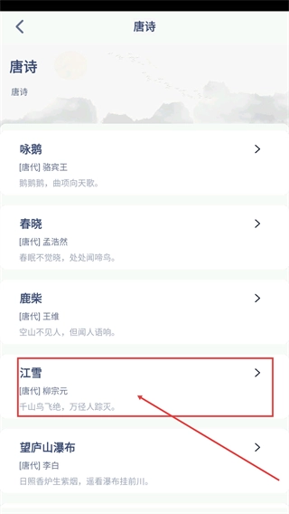 2、进入唐诗列表页面后,找到并点击你想要查看的诗作(例如《江雪》),即可进入该诗作的详情页面。