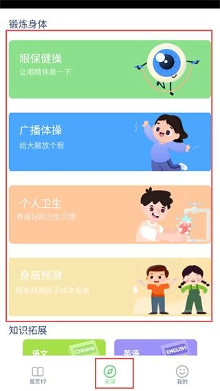 4、点击底部的【拓展-功能按钮】,进入拓展页面后,就能选择眼保健操等功能来使用了。