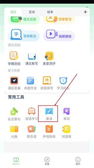 1、在首页的常用工具区域里,找到并点击【唐诗】功能按钮,即可进入唐诗列表页面。
