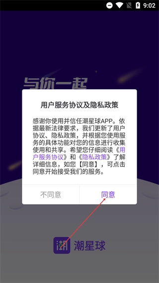 在仔细阅读【用户服务协议】与【隐私政策】的内容后,点击【同意】按钮,就能开启【潮星球】的相关服务流程了。