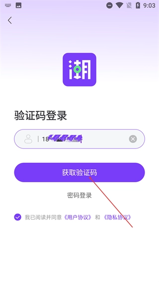 3、进入【验证码登录】界面,先填写手机号,勾选【用户协议】与【隐私协议】,然后点击【获取验证码】按钮。