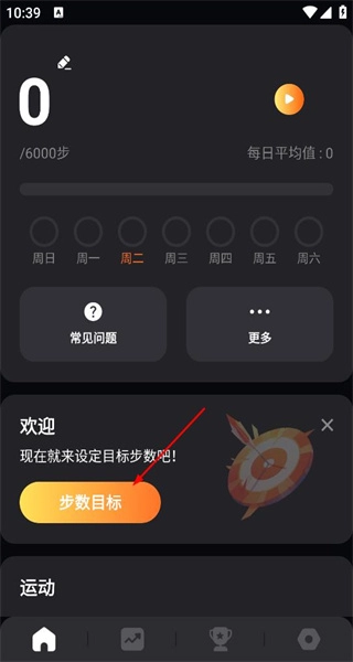 进入软件主界面后,能看到步数进度和日常数据,此时会弹出设定目标步数的提示,点击步数目标按钮即可进入设置页面。