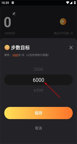 3、进入步数目标设置页面后,会显示推荐步数为6000步,此时可将步数数值调整到所需额度,然后准备执行保存操作。