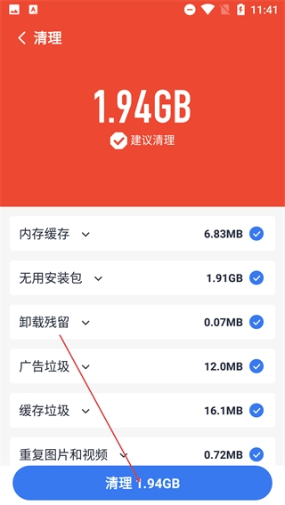 3、授权完成后,系统会扫描出待清理的垃圾文件(例如1.94GB),在确认好勾选的清理项目后,点击【清理1.94GB】按钮即可启动清理操作。