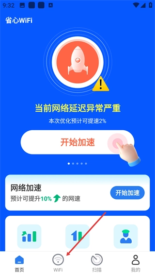1、进入【省心WiFi】界面后,点击底部的【WiFi】选项,即可进入对应的功能页面,在该页面能看到网络相关的操作入口。