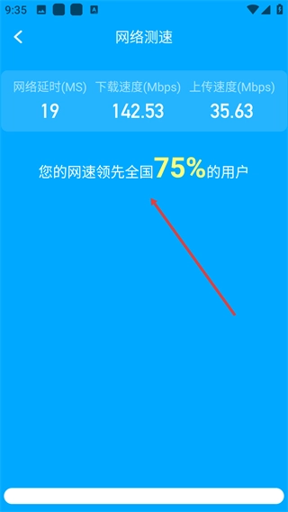 4、测速结束后,能够查看【网络延时-19MS】【速度-142.53Mbps】这类数据,还有网速在全国用户中的领先占比情况。
