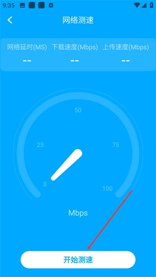 3、进入【网络测速】页面后,点击底部的【开始测速】按钮,即可启动对网络延时以及上传速度的检测。