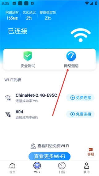 2、进入页面后,找到【网络测速】按钮并点击,点击该按钮即可启动网络速度检测的功能流程。