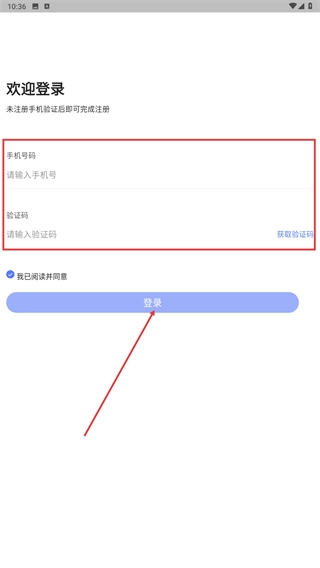 2、在登录页填写【手机号码】并获取【验证码】,勾选协议后点击【登录-功能按钮】。