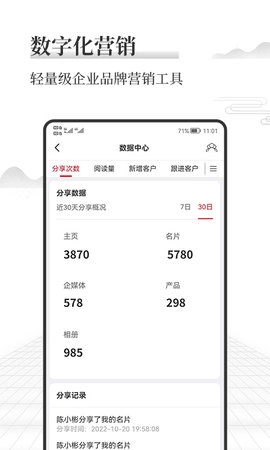 在人脉拓展与管理方面,智条具备便捷的名片处理功能:通过手机拍照即可自动扫描并精准识别名片信息,随后快速同步至通讯录;用户还能对客户资源进行分类整理、跟进记录与权限转让,助力高效的信息化管理。此外,智条提供个人及企业数字电子名片服务,帮助用户快速搭建商业连接,拓宽商务人脉网络。平台还设有功能丰富的专属主页,支持团队在线协作与信息统筹,同时可集中展示企业形象、公司概况、产品矩阵、最新动态、产品图集、联系方式及官方二维码等内容;用户只需一键操作,就能将主页分享至各类渠道进行推广,有效提升企业的品牌形象与市场知名度。