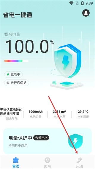 1、在【省电一键通】界面底部,点击【运动】选项,切换至运动功能页面,可查看运动计划相关入口。