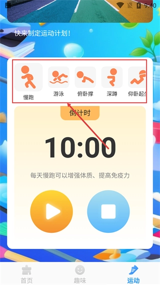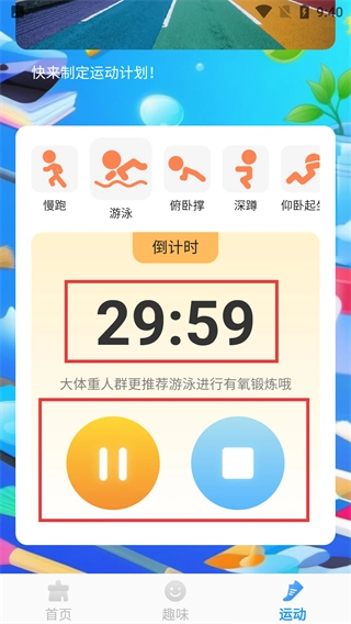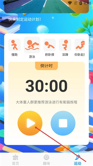 3、选定运动项目后,点击黄色的播放按钮,启动该项目的计时功能,开始记录运动时长。