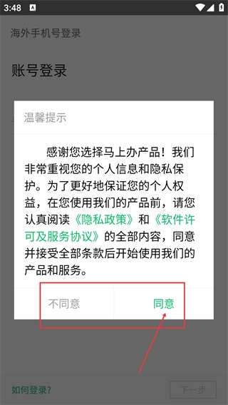 进入【马上办产品】后会弹出温馨提示,需要阅读【隐私政策】与【软件许可及服务协议】,点击【同意】按钮方可继续使用该产品及相关服务。