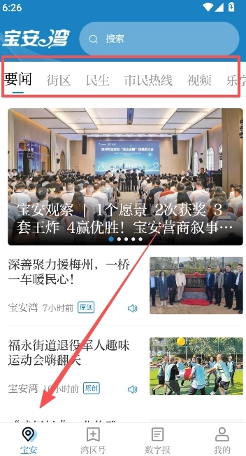 2、软件主要以宝安、湾区号、数字号和我的四个部分组成,其中首页宝安所展示的内容,多为每日最新资讯,都是宝安本地推送的,实时热点话题新闻这里都有。