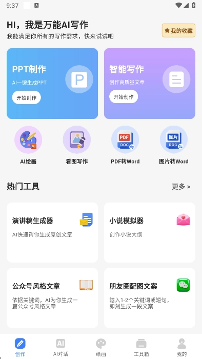 在本站安装万能AI写作并打开后,进入首页就能浏览到创作功能。