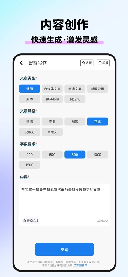 【灵感创作】 不管你是资深的创作达人,还是新媒体热门文案、社交平台内容、情书、对联、总结、报告等的撰写者,全能AI写作都能为你输送取之不尽的灵感,帮你走出瓶颈。