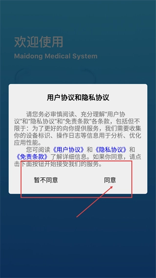 1、进入后会弹出【用户协议和隐私协议】弹窗,阅读条款后点击【同意】按钮,方可进入软件的后续操作环节。