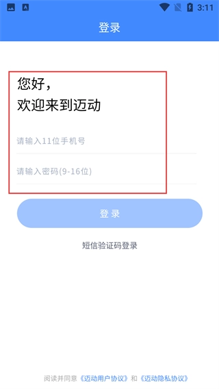 2、登录页展示【您好,欢迎来到迈动】,需填写【请输入11位手机号】与【请输入密码-(9-16位)】,也可选择短信验证码登录方式。
