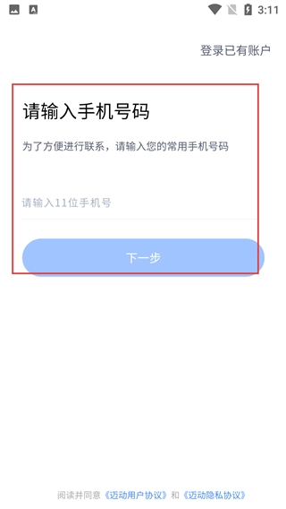 3、进入【请输入手机号码】页面,在【请输入11位手机号】框填写常用号码,然后等待验证码,完成后点击【下一步】按钮推进流程。