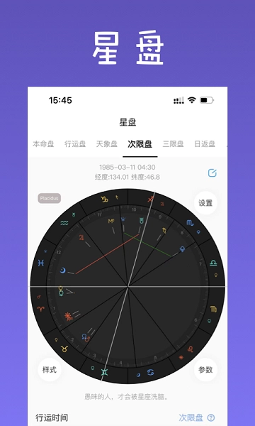 1、日弧盘(Solar Arc)等多种星盘信息都能通过这款软件查看到详情信息。