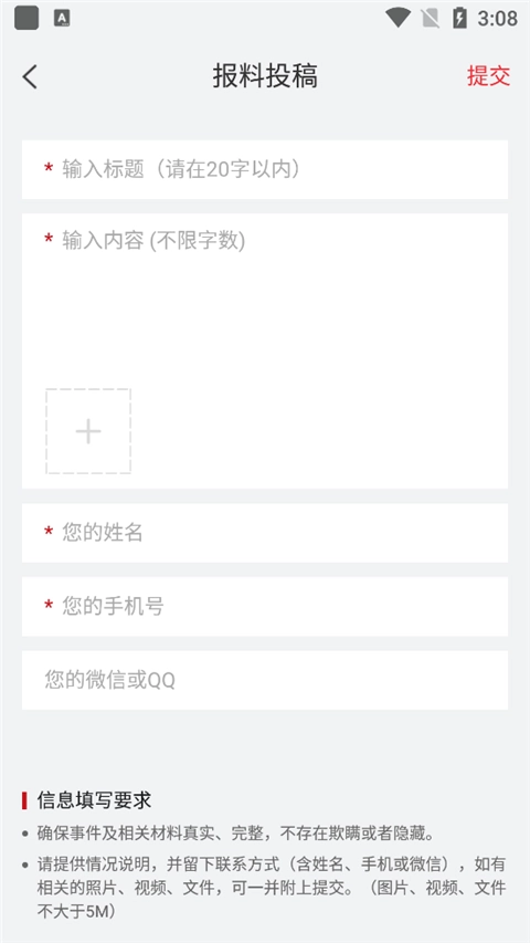 2、输入标题和内容,以及自己的姓名和练习方式,点击提交即可。但是需要注意的是,用户需确保事件及相关材料的真实性和完整性。