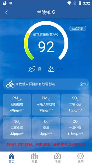 值得一提的是,软件内设置了空气质量排名板块,用户可直接查看全国各省市、全国169个重点城市、全国31个省份、山东省内17个地市、临沂市各区县以及全市各乡镇监测站的空气质量排名情况,以此带动全市人民参与到环境保护的“大比拼”中,具有积极的现实意义。