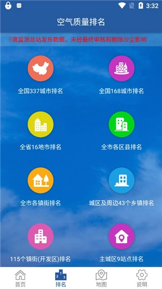 可查看全国各省市、全国169个城市、全国31个省份、全省17个地市、全市各区县以及全市各乡镇站点的排名情况。