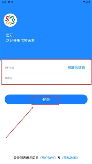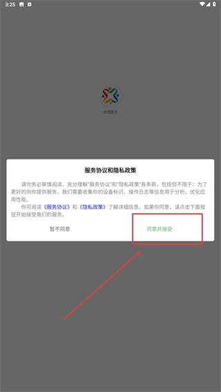 1、阅读【信昱医生】的服务协议与隐私政策后,点击【同意并接受】按钮,进入应用后续流程。