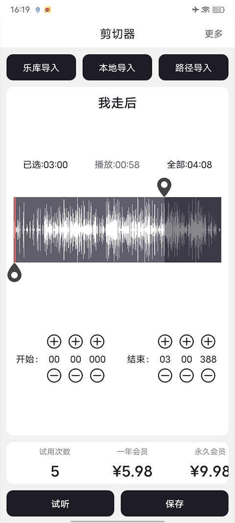 2、导入需要截取的音频,进行玩一番截取操作后点击保存,注意这款软件有5次免费导出的音频的机会,之后可开通9.98永久会员,非常划算。
