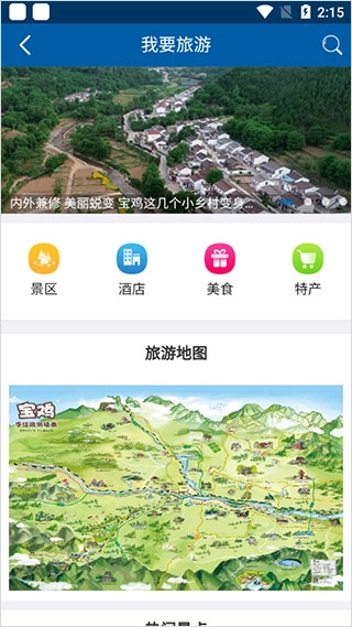 当用户点击“我要旅游”时,可在对应模块区域查看宝鸡市各大旅游景点的相关信息。