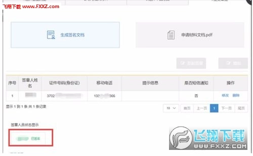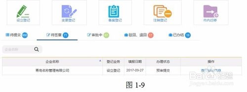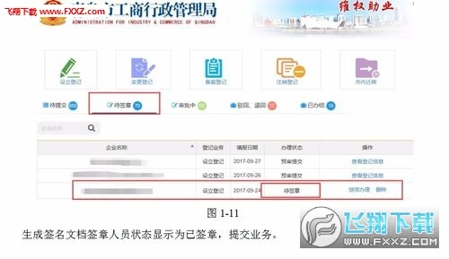 在选择全程电子化登记入口的申报方式提交相关内容后,返回首页,在待签章标签下可找到此次申报的业务,此时其状态显示为预审提交(如图1-9所示);当该业务通过预审后,状态会更新为待签章(如图1-10所示)。