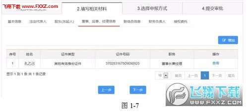 进入图1-7的董事、监事、经理信息页面后,法人信息会自动关联并作为董事、监事、经理成员之一;若需添加其他成员,可点击“增加”按钮进行操作。