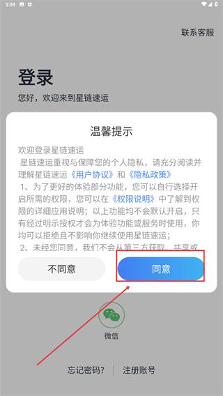 1、阅读【星链速运】的温馨提示及相关协议后,点击【同意】按钮,继续后续登录流程。