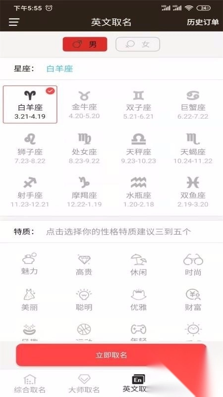 一键取名的操作很简单,只需输入自己的姓氏,选择对应的性别,确定名字的字数是单还是双,再填写出生日期与时辰信息就可以了。