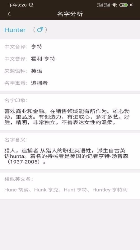 每一个名字都配备了详尽的分析数据,同时还提供了大量可供挑选的相似名字。