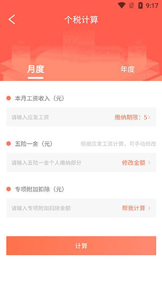 2、计算个人所得税时,大家可输入月度工资或年度工资,以及五险一金金额等进行计算。