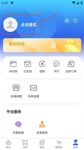 2、进入个人页面后,点击【点击登录】区域,该页包含【待付款】-【店铺收藏】等功能入口。