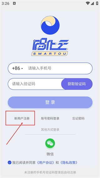 3、登录页需填写【请输入手机号】并获取验证码,也可点击【新用户注册】,支持微信等方式登录。