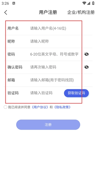 4、【用户注册】页需填【用户名-(4-16位)】-【昵称】等信息,填验证码后同意协议点击注册。