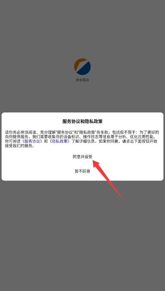打开德泰服务,在仔细阅读服务条款与隐私政策后,点击同意并接受按钮以继续操作。