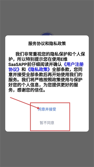 进入应用后,需要阅读《服务协议和隐私政策》,点击“同意并接受”按钮,才能继续使用“E维SaaS-”的相关服务。